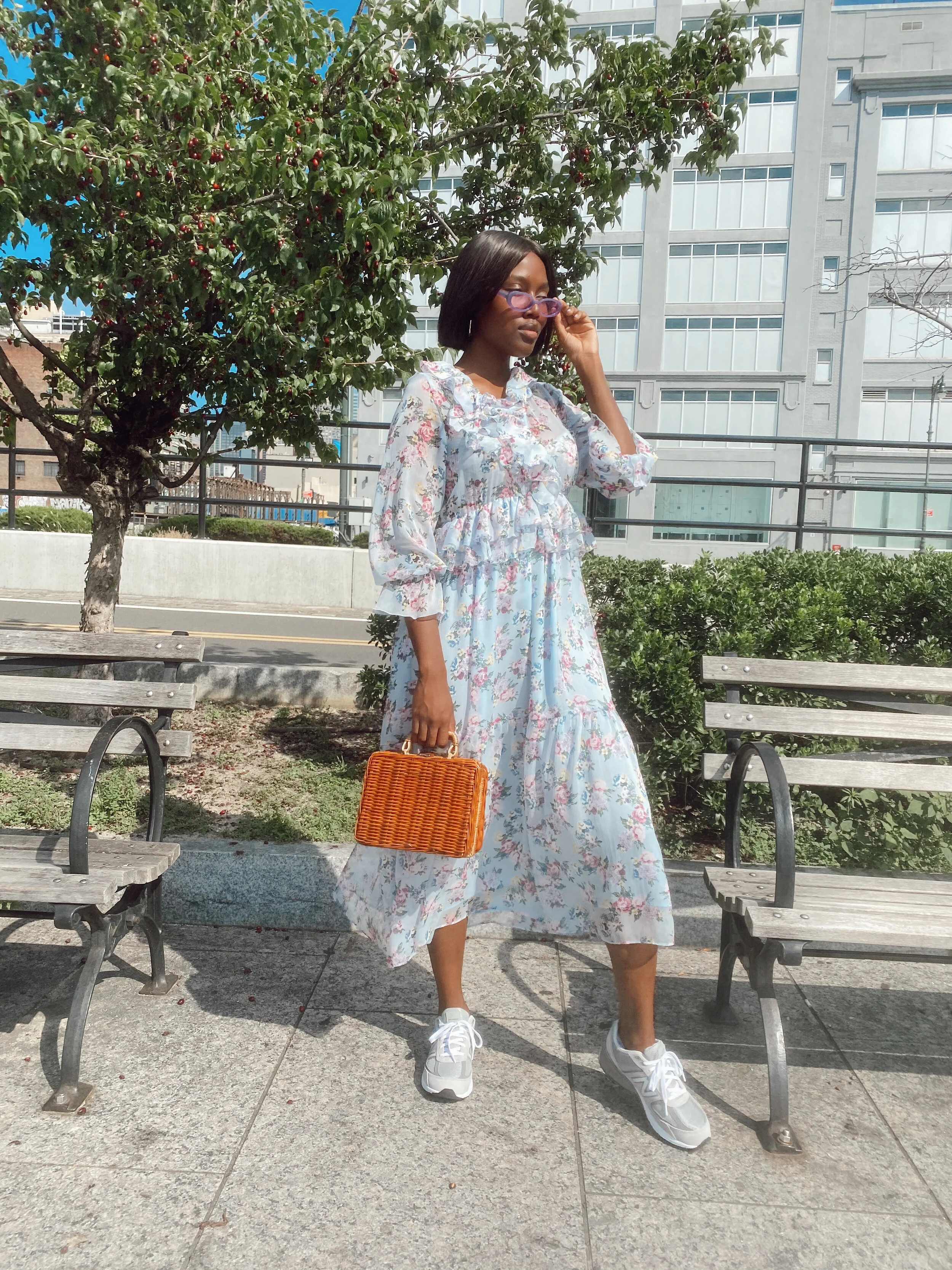 Okay, now that I got that out the way, let us jump into my outfit details. First, this pastel flowy dress is everything to me. It is extremely comfortable and light weight. The dress features a semi-sheer V-neck floral top layer with long sleeves that have ruffled elastic cuffs and interior lining. I was obsessed with the colors as soon as I spotted this dress at Zara. I am not sure if it is just me; but I have been going crazy over pastels colors lately, especially lavender. I hope all my fellow shopaholics took advantage of Zara’s semi-annul sale. I snagged this dress for only $19.99. I love a good dress & sneaker combo so, I had to pair this dress with my 990v5 New Balances. I must admit that I wanted these sneakers for months! I basically waited the entire summer for them to be restocked on KidsFootLocker.com. If you have smaller feet, I suggest finding out what size you wear in kids’ shoes and save some coins the next time you purchase a pair of sneakers. I thought my picnic basket purse and purple sunglasses were a great addition. This outfit was the perfect look to have brunch at Cantina Rooftop, with a few of my favorite people.